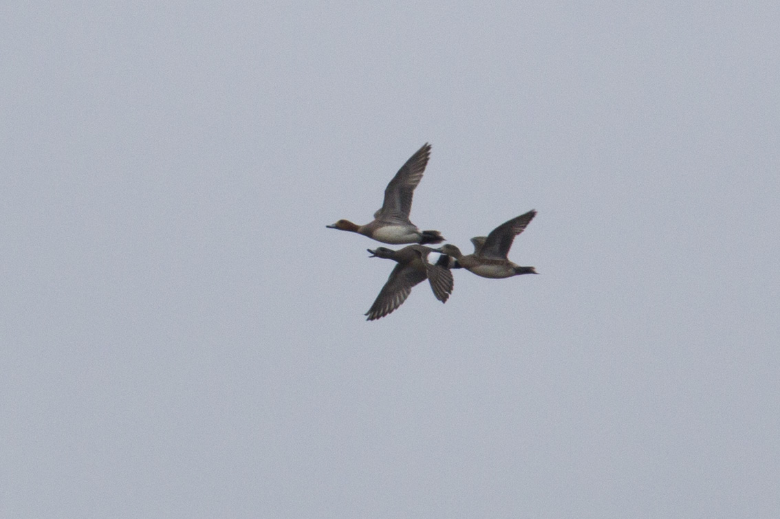 Pirkka sai mielestään riittävät tunnistuskuvat ja lähti. Minä jäin vielä yrittämään telejatkeen kanssa parempia kuvia. Kaiken kaikkiaan oltuani vajaan tunnin paikalla amerikanhaapana ja tavallinen haapanakoiras alkoivat uhkailla toisilleen ja silloin naarashaapana hyppäsi lentoon. Koiraat seurasivat perässä ja jonkin aikaa kolmikko kierteli ilmassa käyden lähempänä minua. Amerikanhaapana äänteli koko ajan, vaikka en sitä kuullut, koska se oli niin kaukana tuulen alla. Kuvista kuitenkin näkyy, että sillä on nokka auki.