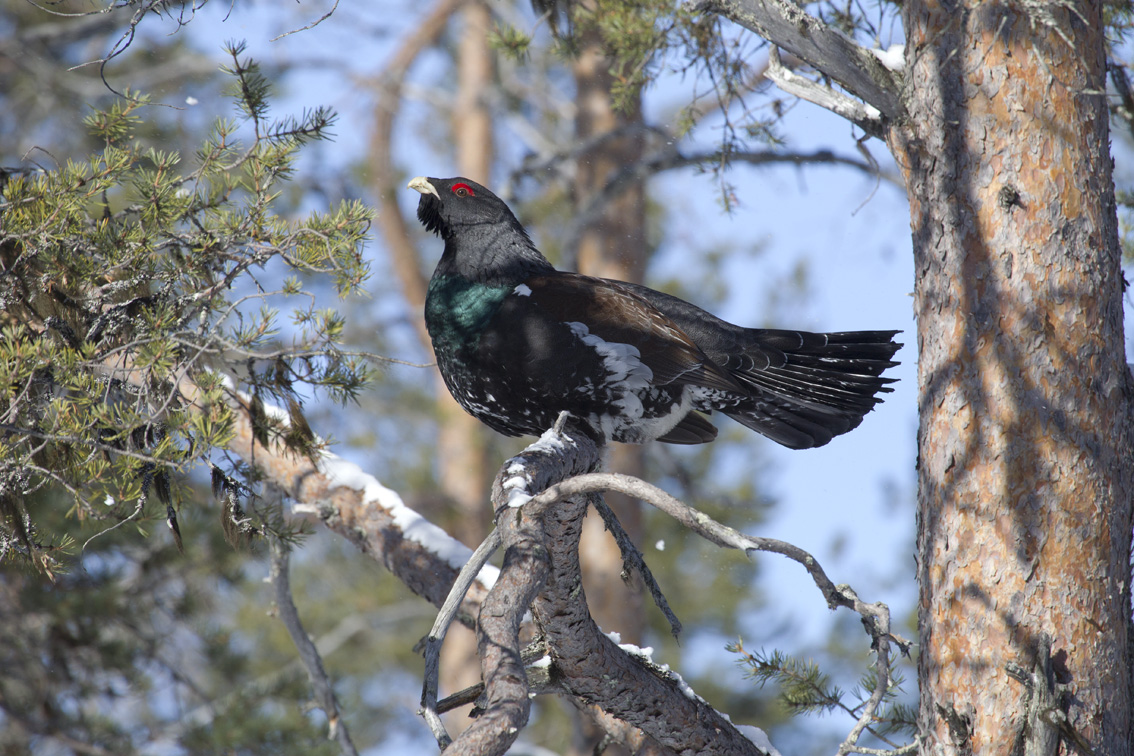 Ukkometso hakoili Vedenjakajan itäpuolen lakimetsässä aamupäivällä. Pulkan koillispuolella oli toinen kahden ukkoteeren lisäksi. Männikkö-koivikkoisessa lakimetsässä nekin, joten ei kaikki metsot ole kankaille siirtyneet tai jääneet.